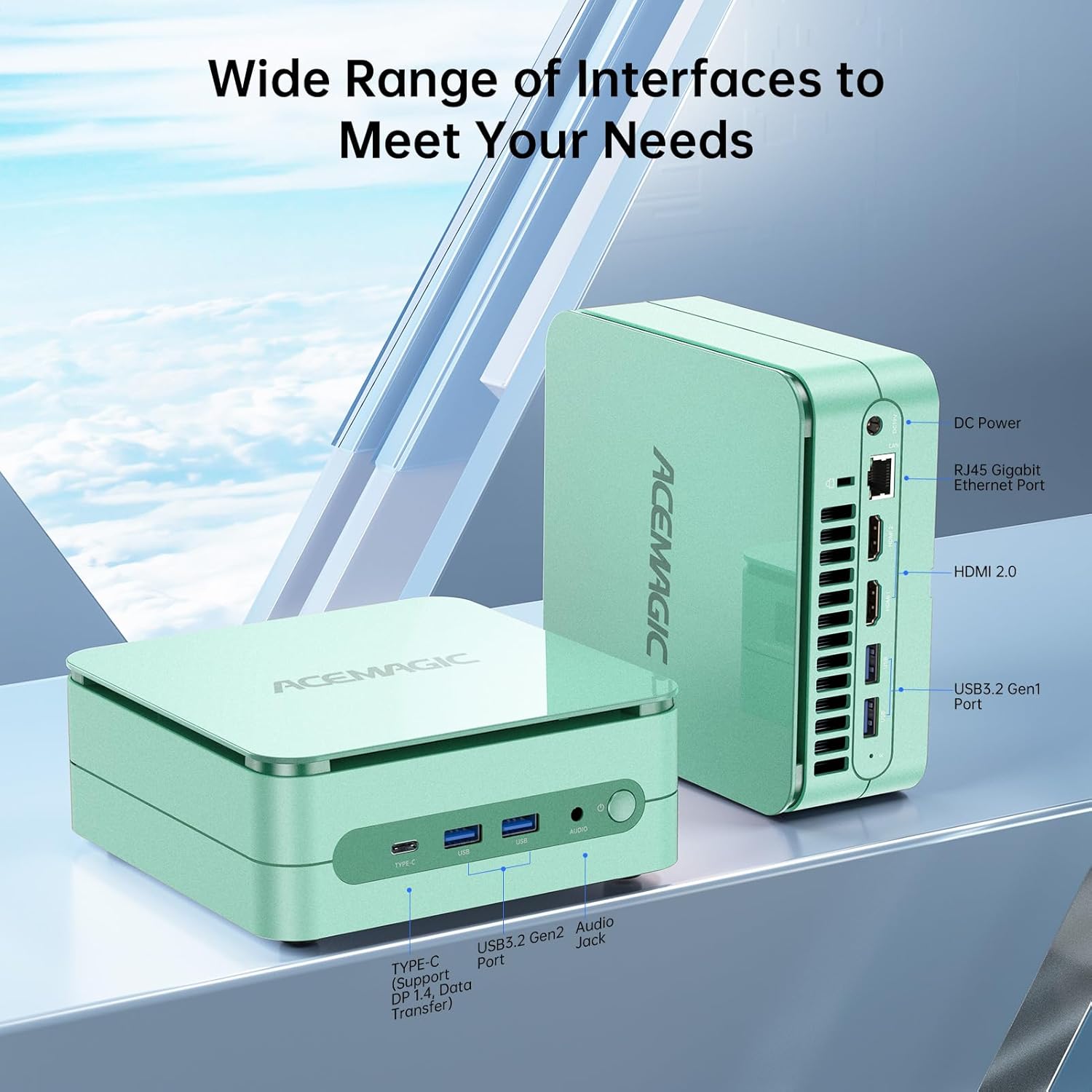 【4K Triple Screen Display & Rich Ports】ACEMAGIC Mini computers support triple monitors display simultaneously via 2 x HDMI(4K@60Hz) and 1 x Type-C (4K@60Hz). Multiple interface designs include: 4 x USB-A Gen1 & Gen2, 1 x USB-C Gen2 (Full function, support DP1.4, 4K@60Hz, 10Gbps, PD 15W), 2 x HDMI 2.0, 1 x 3.5mm audio in/Output Jack,1 x 1000Mbps RJ45 Gigabit Ethernet Port, 1 x DC port (Adapter Included)