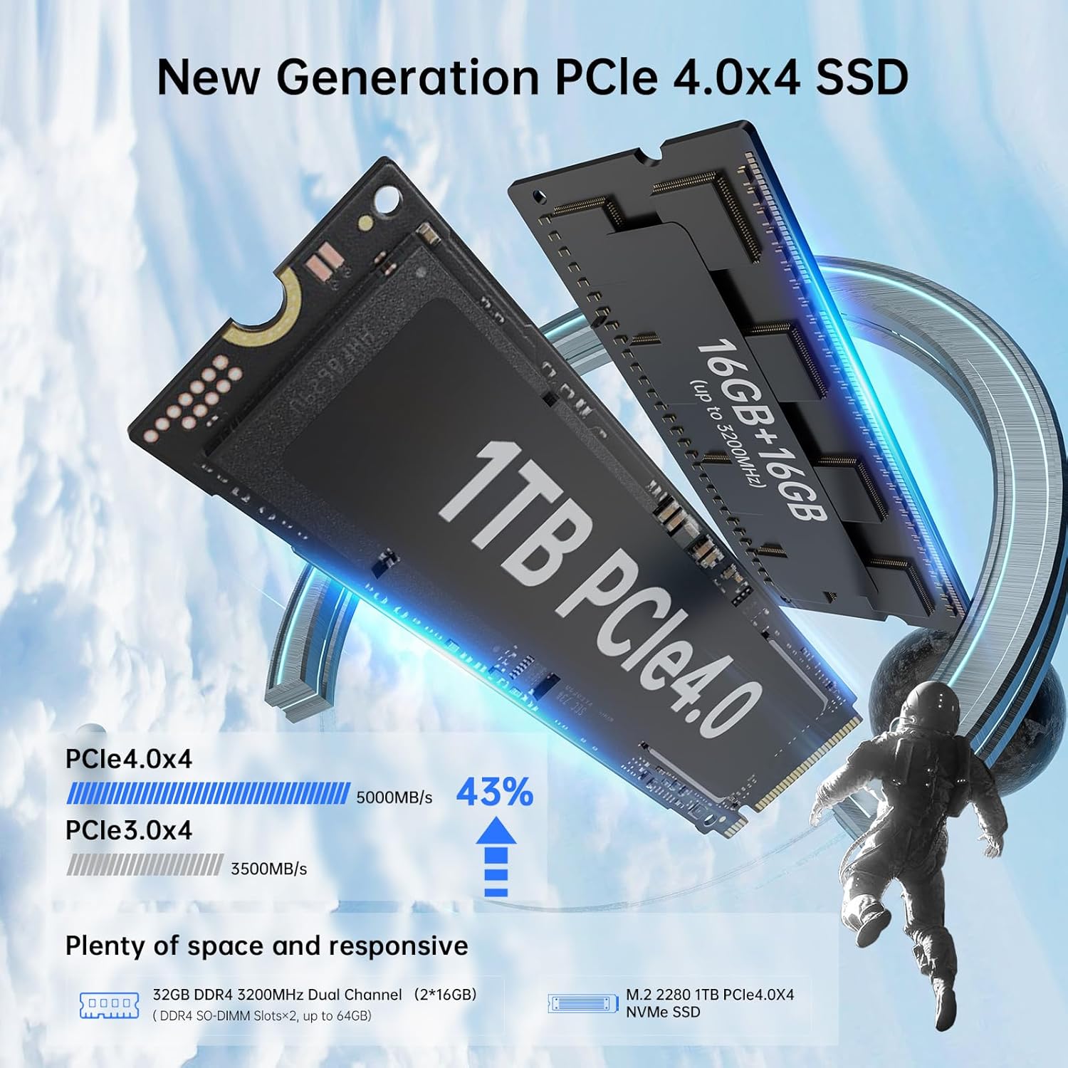 【32GB Dual Channel DDR4 & 1TB SSD】ACEMAGIC i9 Mini computer is equipped with dual channel slots , built in 32GB( 16GB + 16GB) DDR4 3200MHz RAM, up to 64GB (32GB + 32GB). And also comes with 1TB M.2 2280 PCIe4.0 SSD allows for easy expansion with NVME/SATA SSD up to 2TB (not included). No need to worry about running out of space—you can smoothly run software and store and watch large movies and photos without any stress.